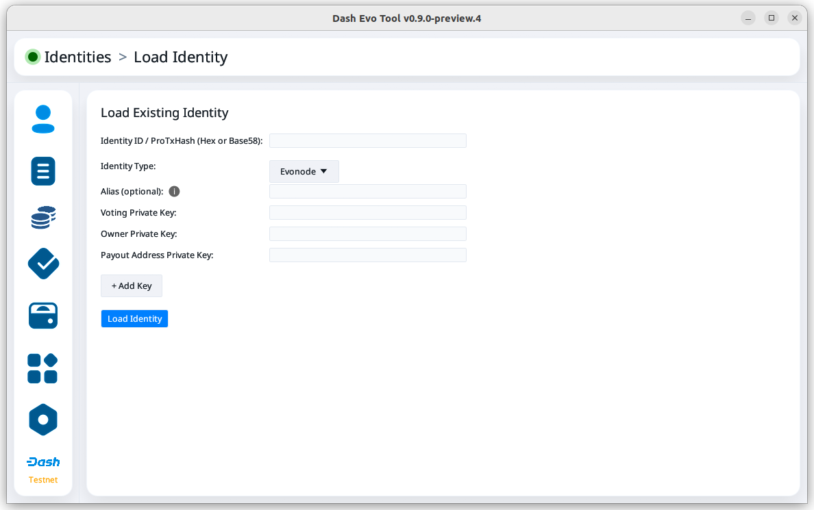Before creating an identity, make sure you have added a Dash Evo Tool wallet.