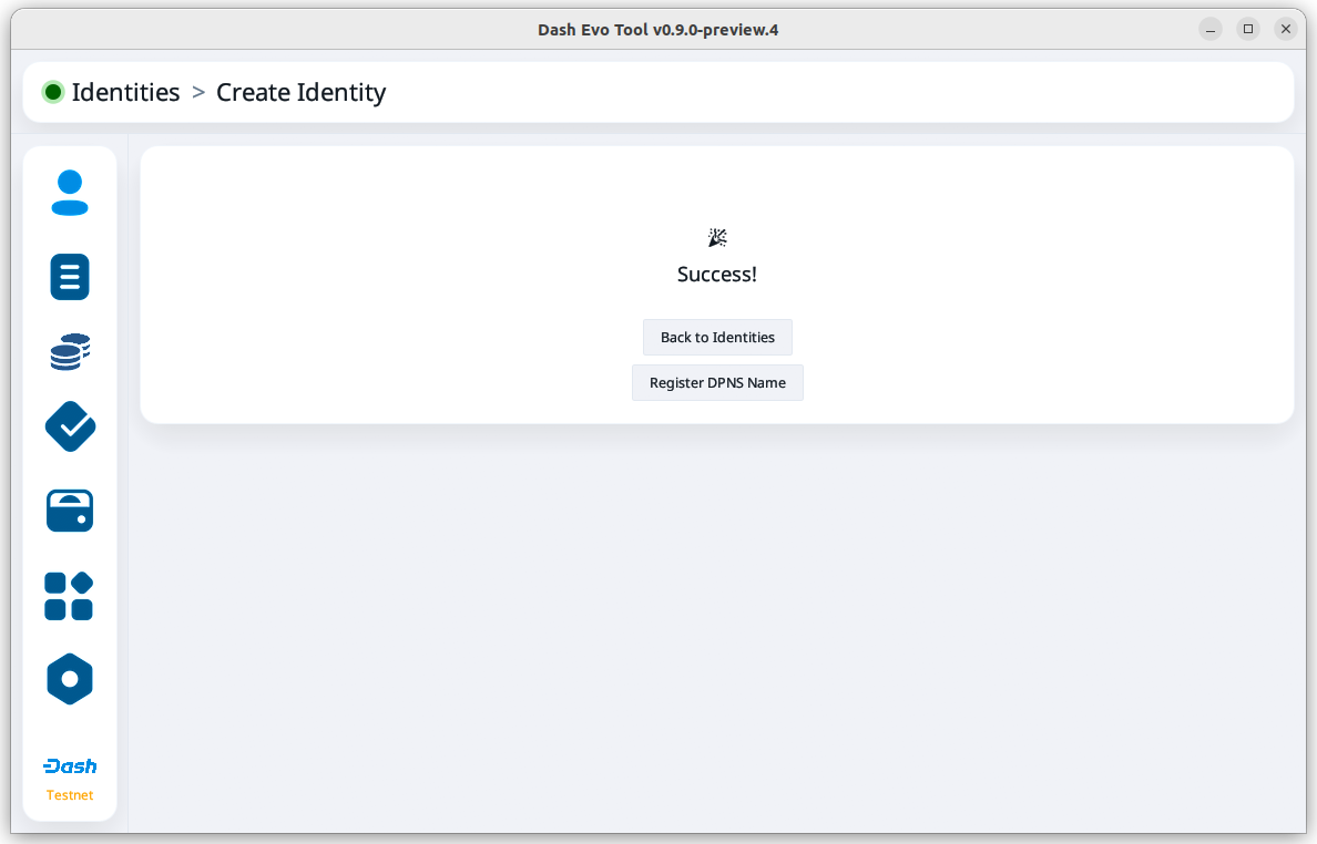 Once the identity has been registered, you can choose to return to the identity screen or proceed to registering a name.