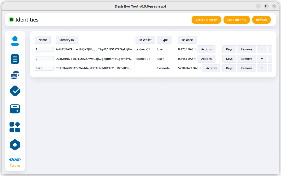 Once the identity is loaded, you can view its balance and details about its keys. For evonodes, you can also initiate withdrawals.