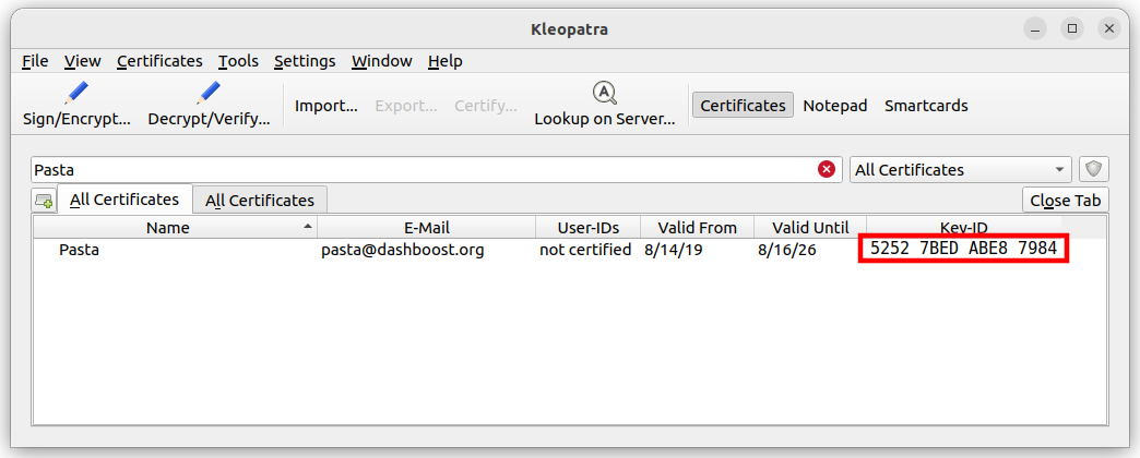 Download the key file above. Install Gpg4win if it is not already available on your computer. Once it is installed, open the Kleopatra certificate manager and click File -> Import. Import the key file and verify the Key-ID matches the ID above.