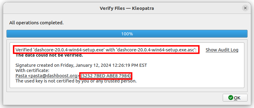 If you see the first line of the message reads Verified dashcore-22.1.3-win64-setup.exe with dashcore-22.1.3-win64-setup.exe.asc then you have an authentic copy of Dash Core for Windows.