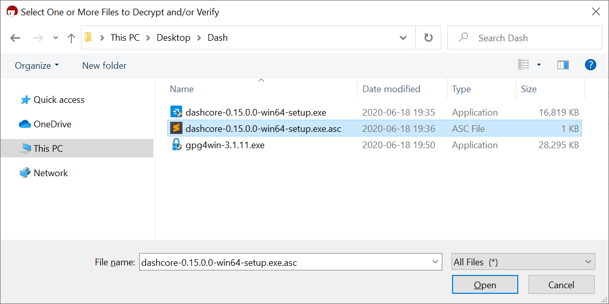 Skip any requests to certify the certificate with your own key. Next, click Decrypt/Verify… and select the detached signature file named dashcore-22.1.3-win64-setup.exe.asc in the same folder as the downloaded installer.