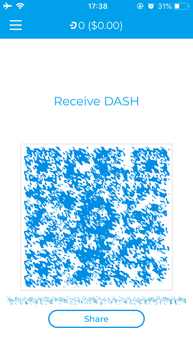Once you have set up your wallet, you will have two screens available to send and receive Dash. You can swipe left and right between the screens. To receive Dash, the app will generate an address which appears at the bottom of the screen. You can tap this to copy and share, or scan the QR code directly. Once the transfer is complete, you can view your balance, transaction history and the status of any pending transactions by clicking the menu button at the top left.