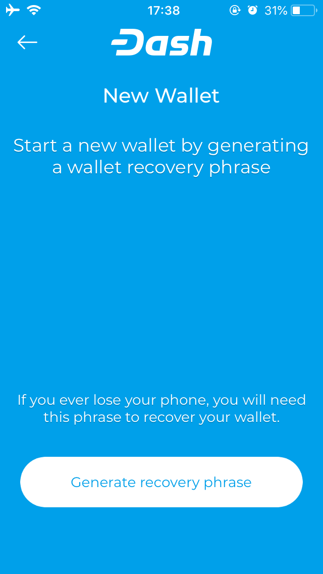 When you first start your Dash Wallet, you will be prompted to choose between creating a new wallet or recovering an existing wallet. Choose New Wallet to create a new wallet unless you have existing funds stored in another wallet using a recovery phrase. Your new wallet will be generated, and a recovery phrase will appear so you can recover the funds later if you lose or damage your phone or need to transfer the account to another device. Write the phrase down and store it in a safe place - if you lose this, you will also lose access to your funds forever.